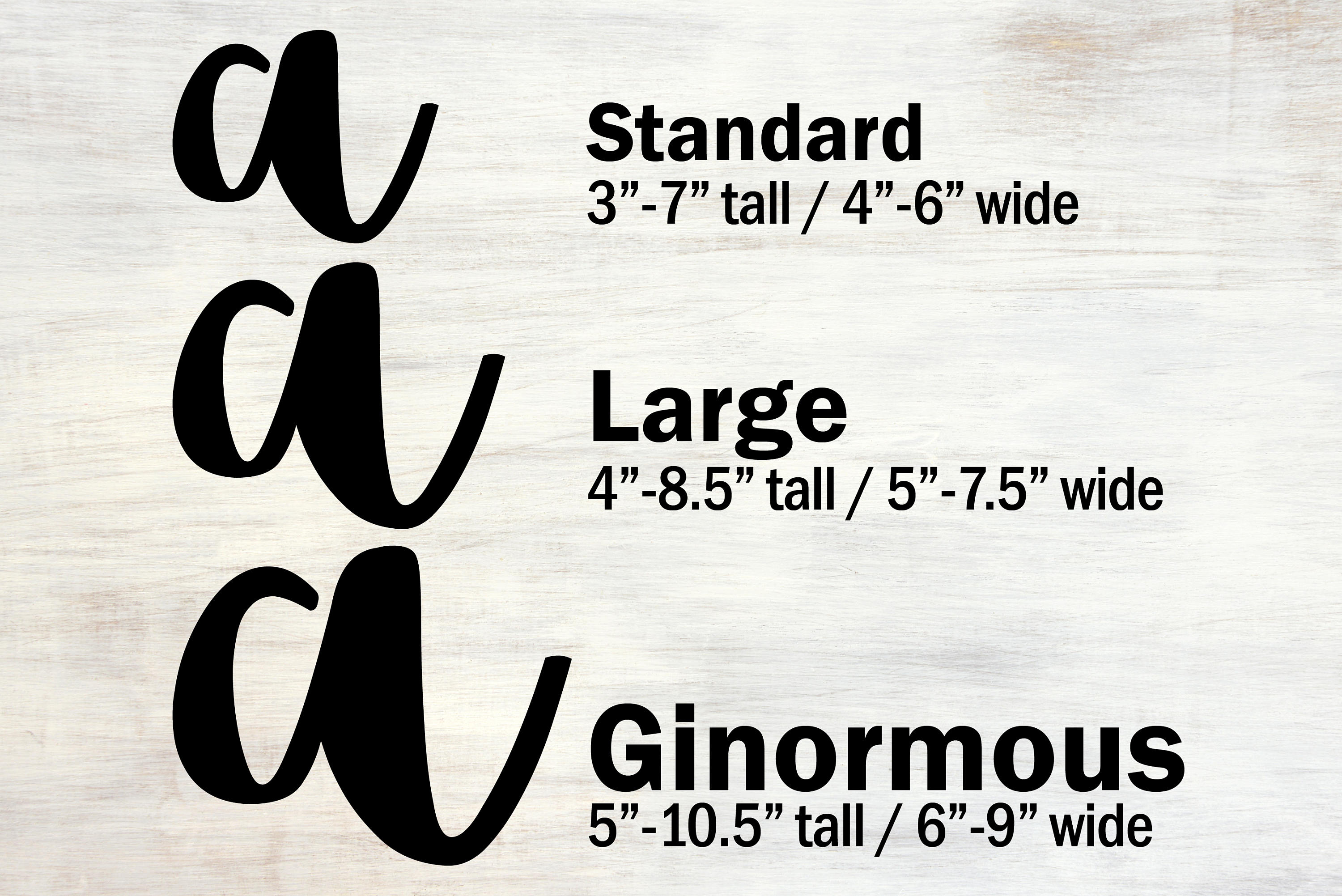 Individually cut letters are between 4″ to 8.5″ tall. Letter width varies slightly depending on letter.